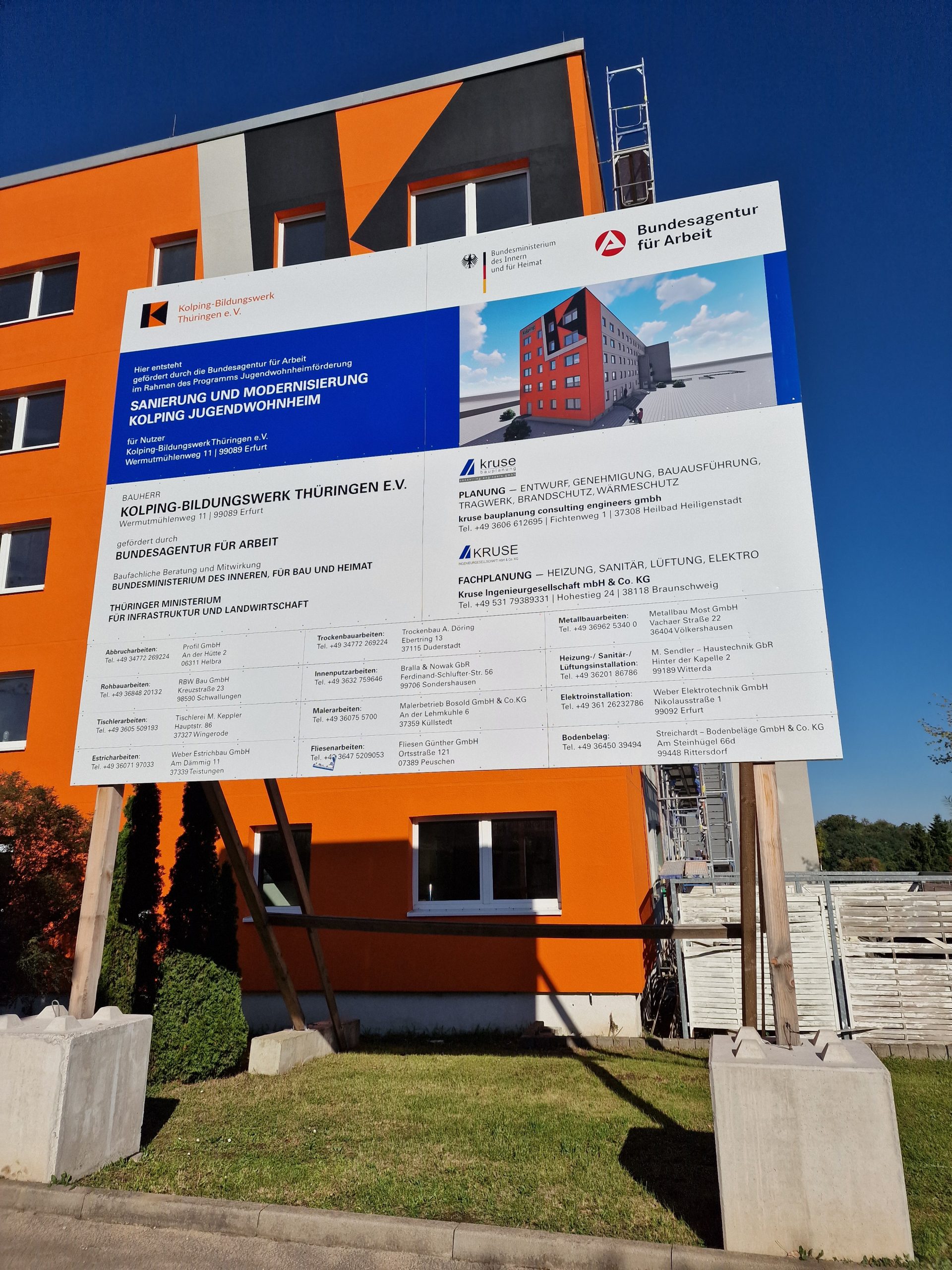 Der Um- und Ausbau des Erfurter Kolping-Jugendwohnhauses macht gute Fortschritte. Das nahe Hauptfriedhof und Flughafen gelegene Objekt wird seit 2023 im Rahmen des 2. Bauabschnittes saniert und modernisiert. Hierzu stehen dem Kolping-Bildungswerk Thüringen e.V. u.a. Fördermittel der Bundesagentur für Arbeit im Rahmen der Förderung von Jugendwohnheimen nach §§ 80a und 80b SGB III zur Verfügung.