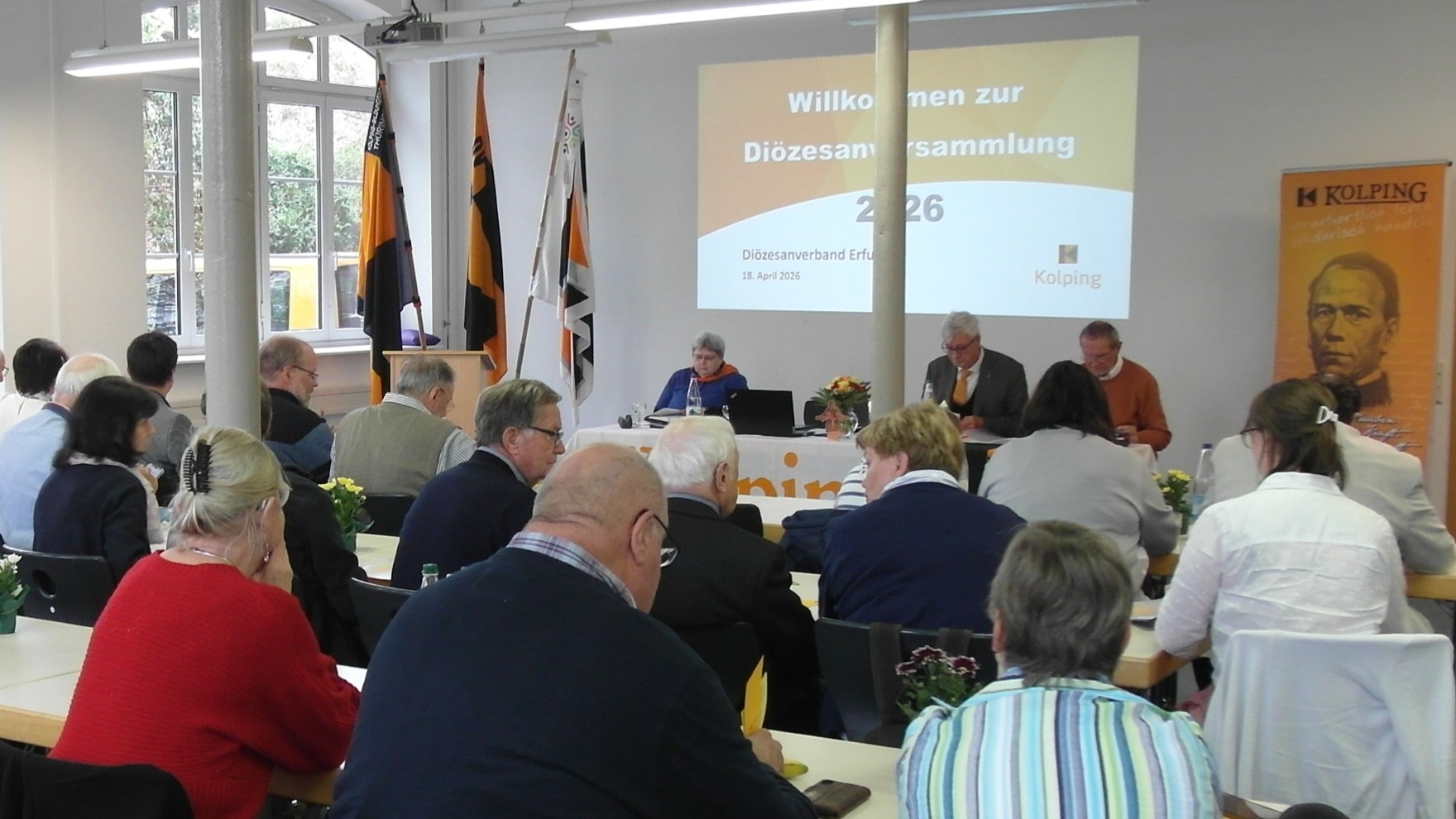 In Bericht und Aussprache fanden, wie schon oft, auch die Kolping-Aktivitäten im Bildungswerk des Bistums sowie im Familienbund Raum und hohe Wertschätzung. Zur diesjährigen Kolping-Wallfahrt, die anläßlich der Landesgartenschau am 30. August in Leinefelde stattfindet, will man erneut öffentlich präsentieren, was ein kleiner Sozialverband an Großem leisten kann. Die für den 6. bis 8. November 2026 geplante erstmalige Tagung des Kolping-Bundeshauptausschusses in Erfurt ist gewiß ebenso eine hohe Würdigung der Arbeit des DV.