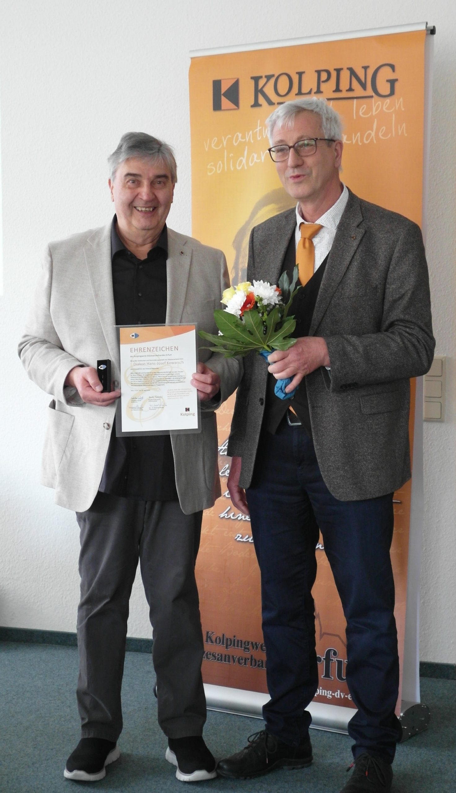 Im Vertrauen auf Gott und die Kraft der Kolping-Gemeinschaft bilanzierten am Wochenende (18.4.) Delegierte aus 19 Thüringer Kolpingsfamilien ihre Arbeit des zurückliegenden Jahres und besprachen die aktuellen Aufgaben des Diözesanverbandes. „Unser kleiner Verband“, so der wiedergewählte Diözesanvorsitzende Hans-Josef Kowarsch im Jahresbericht, „belegt mit zahlreichen Aktionen, dass Kolping-Geist bei uns lebt.“ So beten die Thüringer Kolpingmitglieder in unfriedlichen Zeiten nicht nur verstärkt um den Frieden, sie intensivierten ebenso ihre direkte Hilfe für Notleidende in der Ukraine. Wie Natalia Blümel dazu berichtete, werden z.B. vom DV Erfurt 28 ukrainische Patenkinder, deren Väter im Krieg gefallen sind, finanziell unterstützt, „damit deren Liebe nicht in Hass übergeht“.